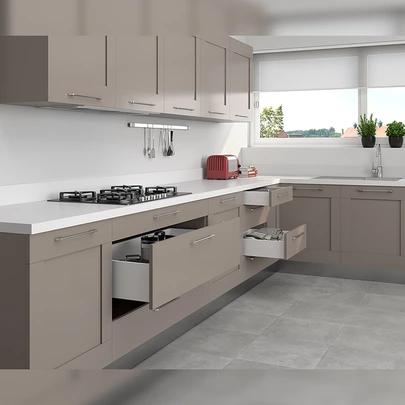 El cajón de cocina y baño Concept está disponible en formato kit con todos los herrajes necesarios para su montaje. Destaca además por su gran capacidad de carga que puede llegar a soportar hasta 30 kg por cajón. Incluye guías de extracción total con cierre suave, juego de enganches y costillas disponibles en acabado pintado blanco o gris antracita. Usted sólo necesitará los tableros cortados a las dimensiones correctas para el fondo, la parte trasera y la frontera del cajón.