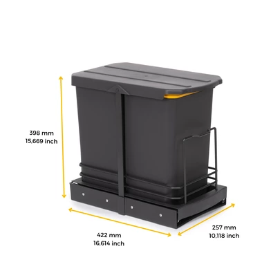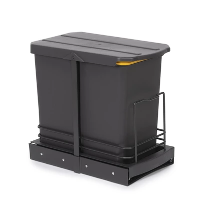 - Está fabricado en acero y plástico en acabado color gris antracita. Dispone de dos cubos de basura con una capacidad de 12 litros cada uno, con una asa simple para facilitar la extracción.