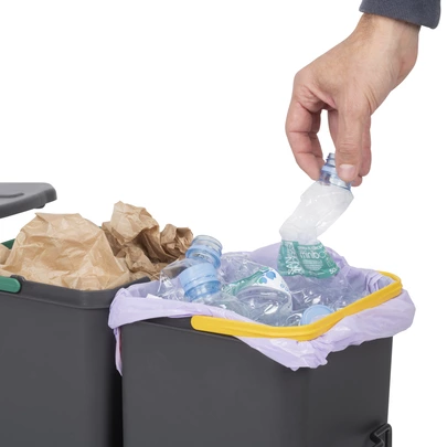 Dispone de dos cubos de basura con una capacidad de 12 litros cada uno, con un asa simple para facilitar la extracción. Está fabricado en acero y plástico con un elegante acabado en color gris antracita.