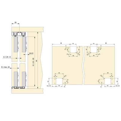 - Sistema para 2 puertas de madera apoyadas con guiador superior diseñado para instalación en muebles.