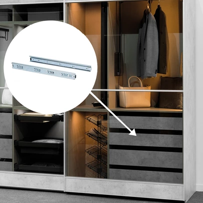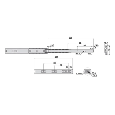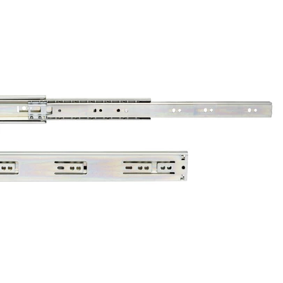 Guías de bolas con extracción total fabricadas en acero cincado. Guía de altura 45mm. Se fija al costado del mueble mediante tornillos (no incluidos) y disponen de un gatillo para su desmontaje. Carga máxima de hasta 30kg.