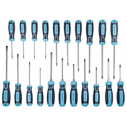 Con 21 destornilladores diferentes, este juego ofrece una variedad de opciones para satisfacer diversas necesidades. Los mangos ergonómicos de dos componentes garantizan un manejo cómodo y permiten un control preciso, 10 destornilladores Torx de acero S2 con punta pavonada magnética (T6 x 75 mm T7 x 75 mm T8 x 75 mm T9 x 75 mm T10 x 100 mm T15 x 100 mm T20 x 125 mm T25 x 125 mm T27 x 150 mm T30 150 mm). 4 destornilladores planos de acero S2 con punta pavonada magnética (3,0 x 75 mm 4,0 x 100 mm 5,5 x 125 mm 6,5 x 150 mm). 3 destornilladores planos de acero S2 con punta pavonada magnética, base hexagonal y cabezal de golpe (4,5 x 75 mm 5,5 x 100 mm 6,5 x 125 mm). 2 destornilladores Philips de acero S2 con punta pavonada magnética (PH1 x 75 mm PH2 x 100 mm). 2 destornilladores Philips de acero S2 con punta pavonada magnética, base hexagonal y cabezal de golpe (PH1 x 75 mm PH2 x 100 mm).