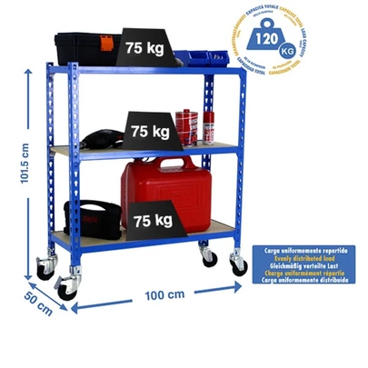 Estanteria metalica sin tornillos con 3 estantes d e bandeja de aglomerado. Estanteria que se monta d e forma facil y comoda gracias a su sistema de cli ck, sin tornillos simplemente con la ayuda de un m artillo podras tener esta estanteria montada en ap roximadamente 12 minutos. Tienes a tu disposicion un video detallado de montaje en Youtube. Al lleva r ruedas, la capacidad de carga de la estanteria e n total es de 120 kg uniformemente repartida. El p rimer larguero debe estar en el agujero inmediatam ente superior a la rueda. La estanteria tiene un f ondo de 50 cm. Contiene un recubrimiento plástico y acabado en epoxypoliester. Ademas es muy fácil d e limpiar. Manipulación del producto sin aristas d e corte, sin riesgos de manipulacion. Es un produc to fabricado en España. Medidas en uso del product o: 952x1100x510 mm