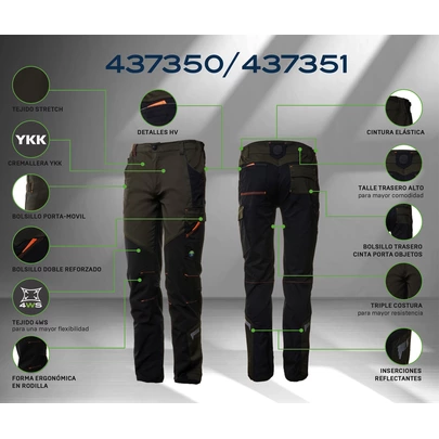 Pantalón gris/negro con detalles fluorescentes en color verde y tejido stretch con triple costura para mayor resistencia. Cintura elástica y talle trasero alto. Ajuste en cadera con elásticos laterales. Cierre de cremallera YKK y botón personalizado Inserciones reflectantes en el lateral y la parte inferior de los pantalones. Tejido 4WS para mayor flexibilidad. Rodilleras reforzadas con forma ergonómica de nylon en contraste con tejido principal. Bolsillos delanteros abiertos en cintura. Bolsillo porta-movil. Bolsillo doble reforzado ubicado a la izquierda del usuario. Bolsillo trasero con cinta porta objetos. COMPOSICIÓN: Tejido stretch 245 g/m² + 4WS Tejido contraste: 86 % nylon, 14 % elastano, 240 g/m². Tejido bolsillos: Forro: 80 % poliéster, 20 % algodón, 110 g/m².