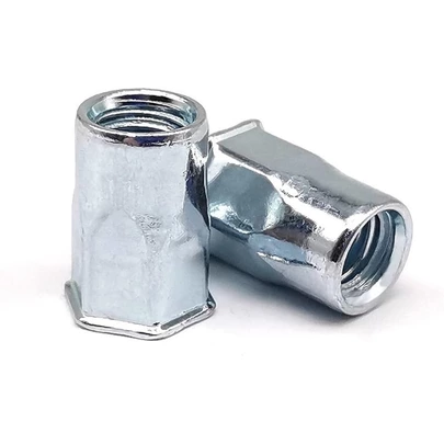 Componente de fijación mecánica tipo tuerca remachable de alta resistencia con rosca métrica interna M10. Presenta un cuerpo de geometría hexagonal diseñado específicamente para insertarse en orificios hexagonales, lo que garantiza una fijación antigiro total frente a pares de apriete elevados. Fabricado en acero con recubrimiento cincado para protección galvánica contra la corrosión, este modelo incorpora una cabeza ancha (ala ancha) que incrementa la superficie de apoyo, permitiendo el reparto de cargas sobre materiales de bajo espesor o ductilidad, evitando desgarros en el material base. Su diseño de extremo abierto permite el paso del espárrago roscado sin limitación de longitud, siendo ideal para aplicaciones en automoción, estructuras metálicas y paneles industriales donde el acceso es unilateral.